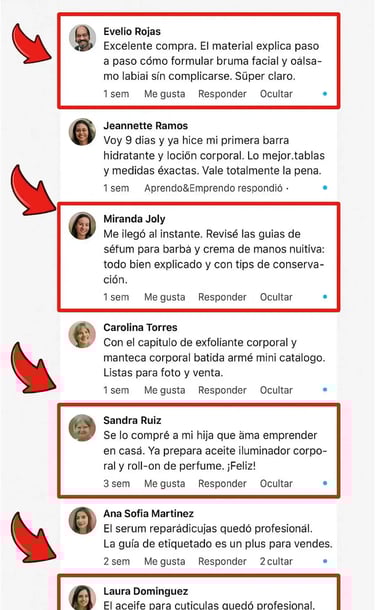 Tenía muchas dudas sobre por dónde empezar y, sobre todo, cómo formular de manera segura. Con el checklist de 7 días y el paquete de material (guías claras + muchas fórmulas bien estructuradas con percentajes y pasos), pude lanzar 3 kits desde mi cocina (jabón, bálsamo labial y crema corporal). La cantidad y la calidad de las recetas me dieron confianza total: los productos quedaron estables, seguros y con acabado profesional. En dos semanas hice 14 ventas a amigas y vecinas y recuperé la inversión. Hoy tengo un mini-inventario y un plan claro para escalar.